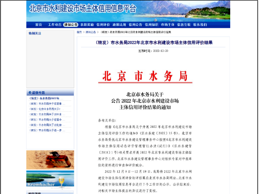 2022年12月22日,北京市水務(wù)局發(fā)布關(guān)于公告2022年北京市水利建設(shè)市場主體信用評價(jià)結(jié)果的通知,集團(tuán)公司以90.5的高分通過了此次評價(jià),獲得了高等級AAA級信用評價(jià),為集團(tuán)公司開拓水利業(yè)務(wù)打下了良好的基礎(chǔ)。